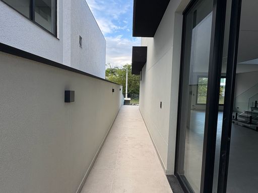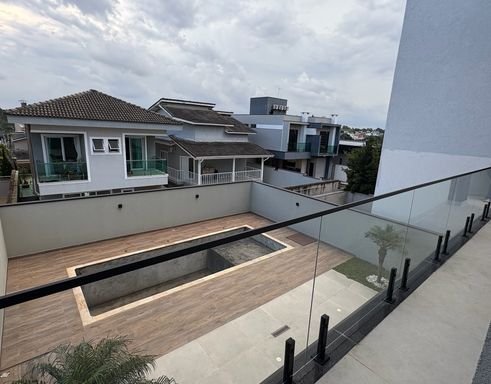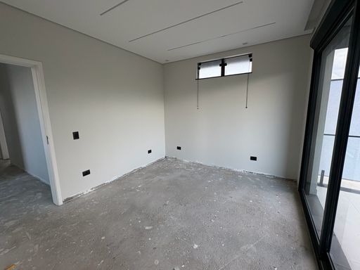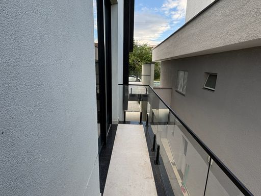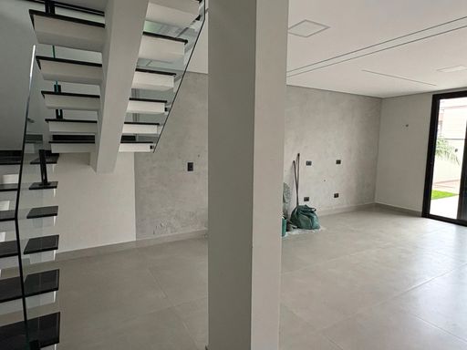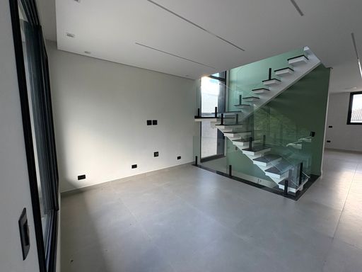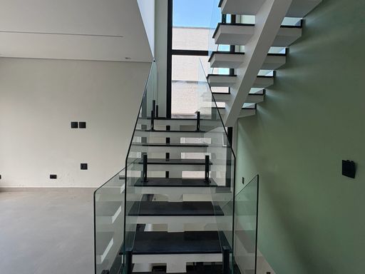 A residência possui ambientes amplos e integrados, com sala iluminada por grandes esquadrias de vidro, proporcionando conforto e ótima ventilação natural. A escada com design moderno e guarda-corpo em vidro agrega sofisticação ao projeto.