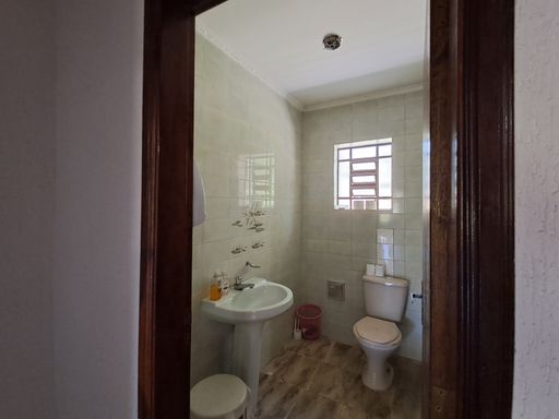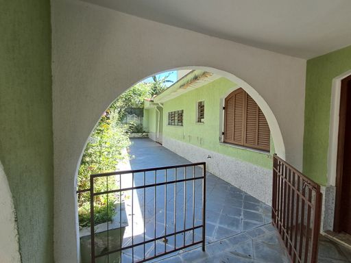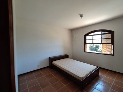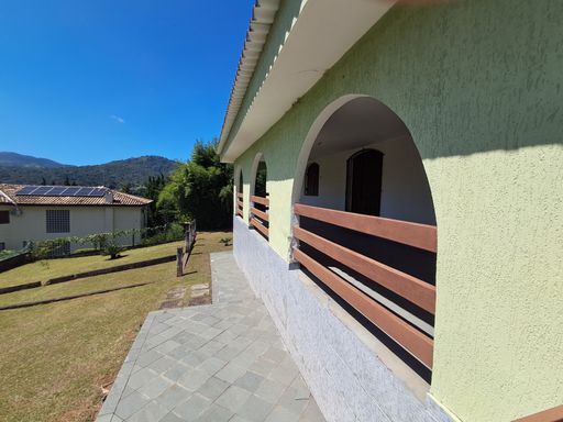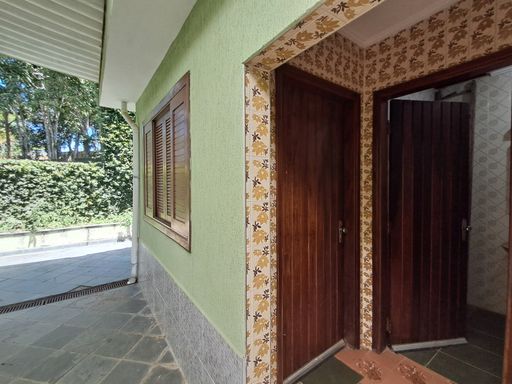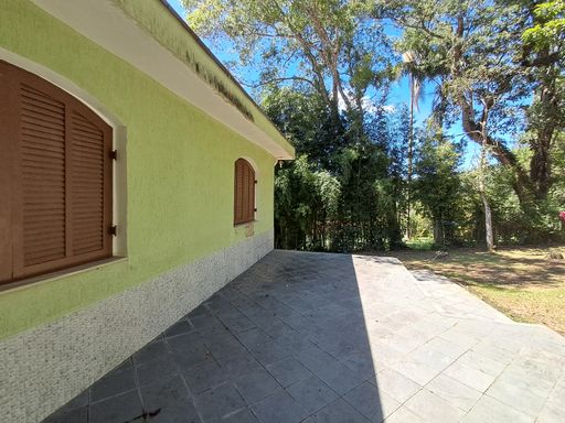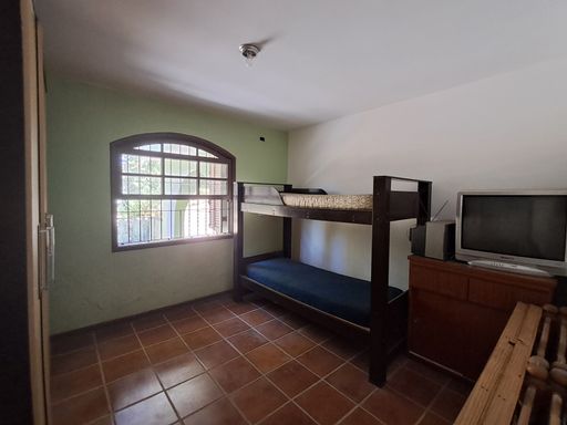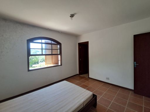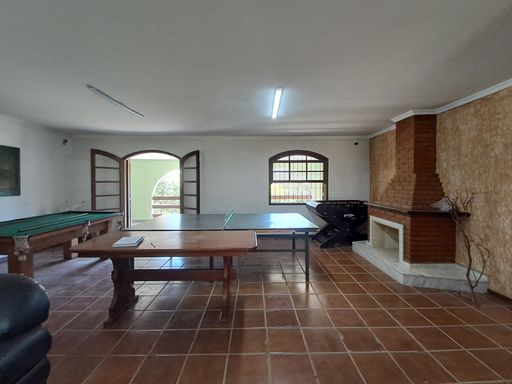 A casa principal conta com uma sala ampla com lareira, proporcionando um ambiente aconchegante, além de lavabo, cozinha espaçosa, lavanderia e varanda com vista para a área verde nos fundos.